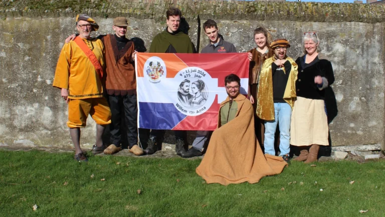 De vlag van het 475-jarig huwelijksjubileum te midden van de vrijwilligers. Foto: Elly van Kuilenburg Buren – Zorgboerderij Benaja uit