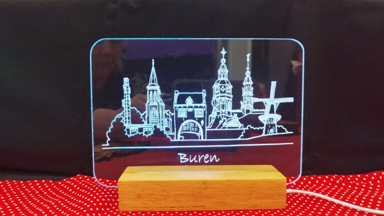 Buren skyline op acrylaat met Led lampje diverse kleuren/warm wit. Prijs € 16,95 Ca. 19×17 cm. (b x h)1 Buren