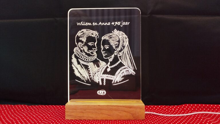 Willem en Anna 475 jaar op acrylaat. Prijs € 16,95 Lampje links een lijntekening warm wit.Lampje rechts een afbeelding, met