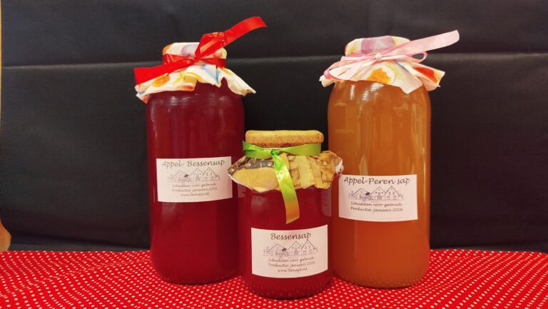 Appel-Peren sap Prijs € 3,00 Inhoud: 1 literCa. Appel 70%, Peer 30% Bessensap Prijs € 1,50 Inhoud: ca. 500mlRode bessen